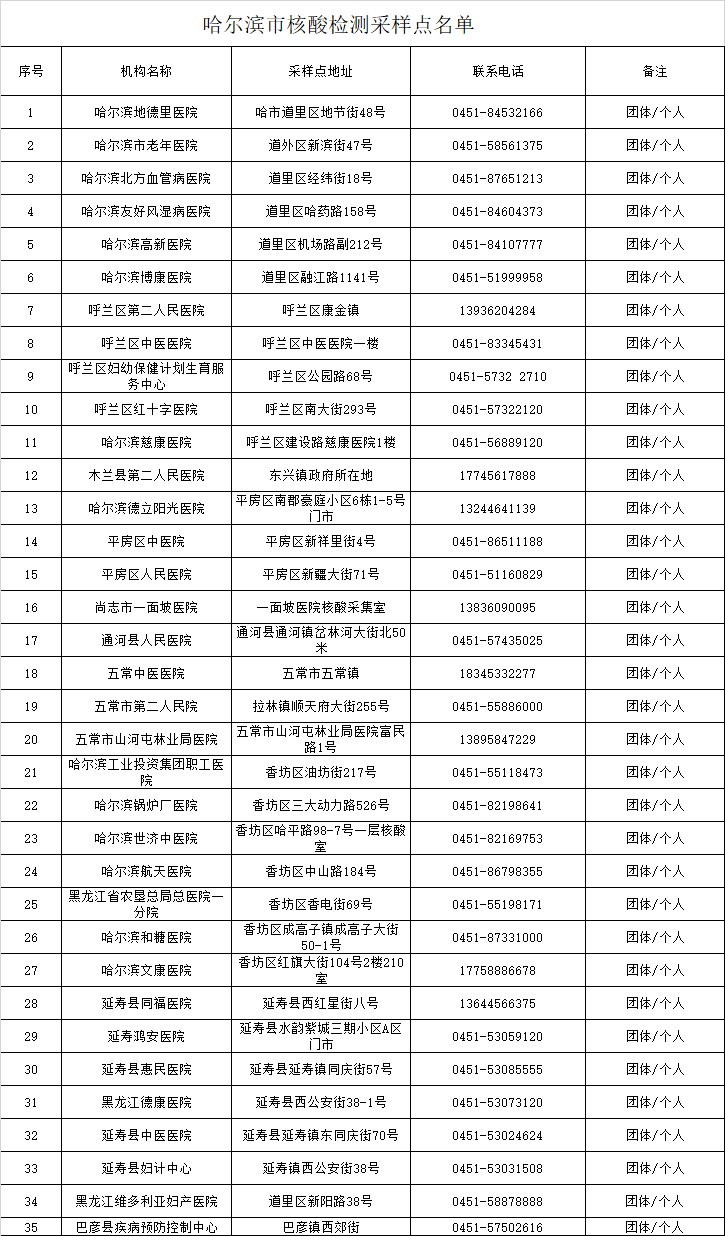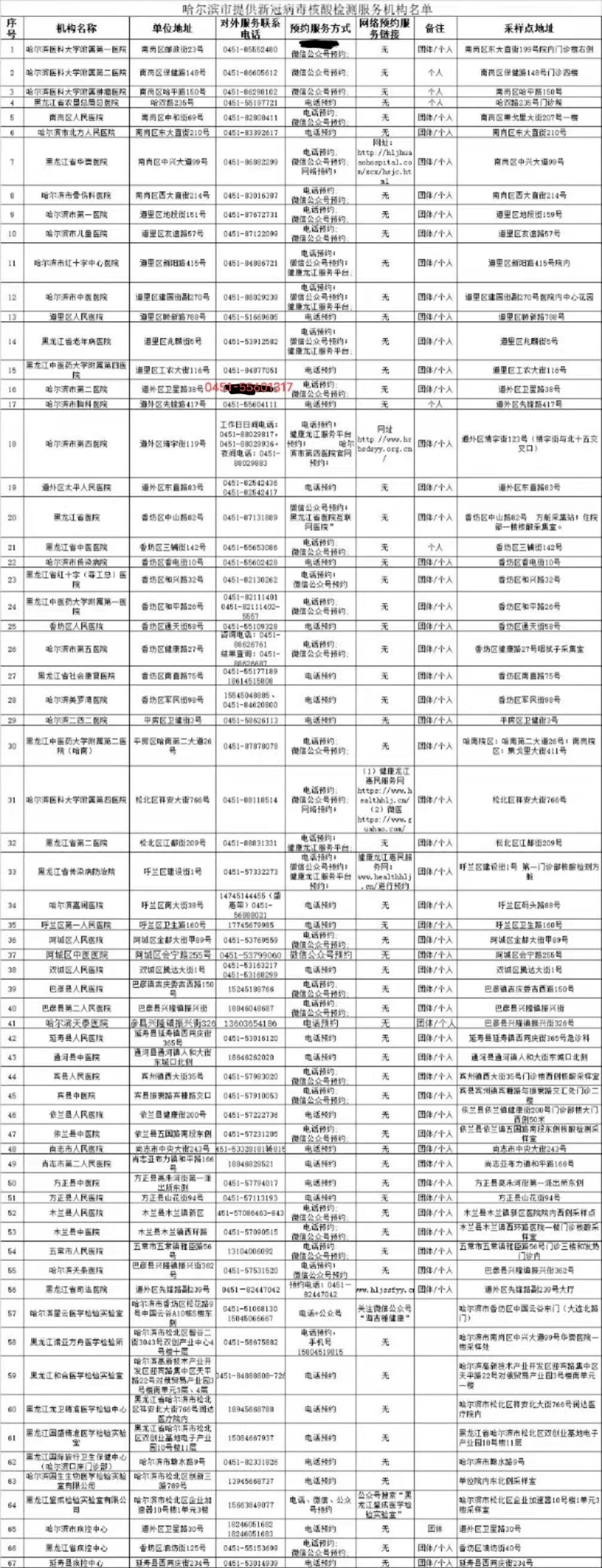 为做好哈尔滨市秋冬季新冠肺炎疫情防控工作,维护人民群众生命安全和身体健康,哈尔滨市卫健委将哈尔滨市提供新冠病毒核酸检测服务机构名单、核酸检测采样点名单以及开设发热门诊的医院名单公示如下: (点