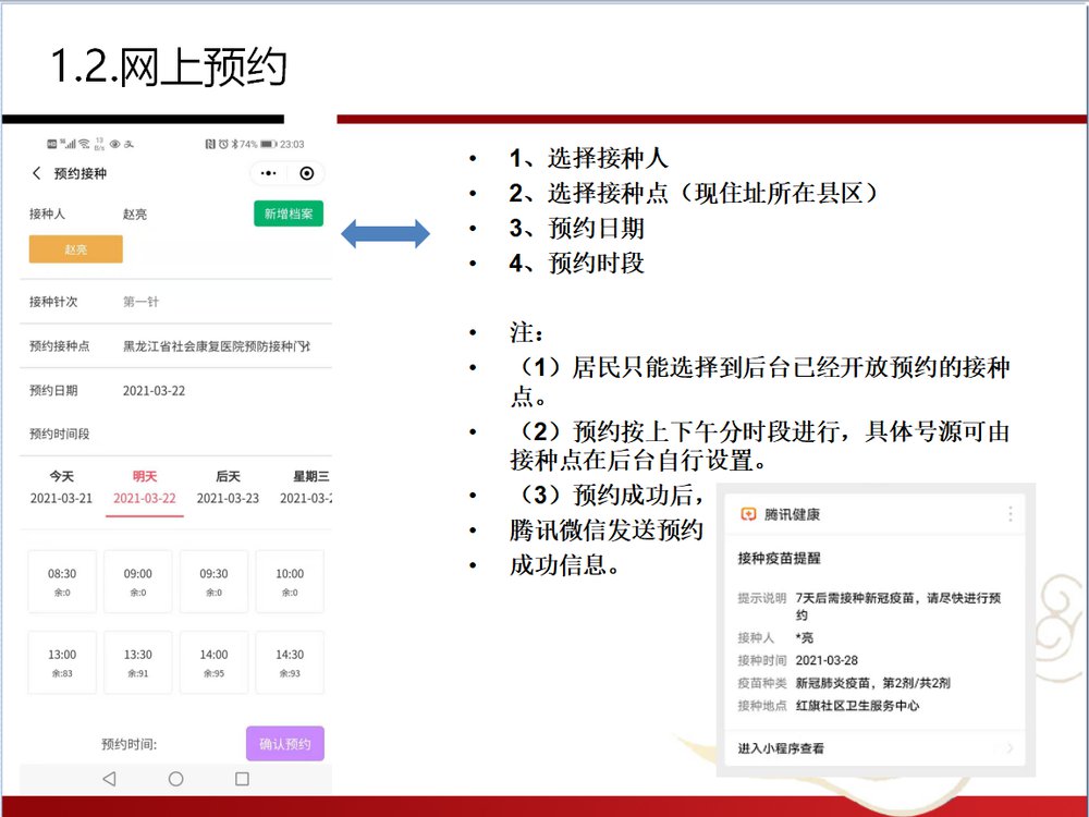 哈尔滨新冠疫苗接种预约操作指南: 哈尔滨新冠疫苗预约方式: 一是线上预约,公众可以通过微信小程序“健康龙江服务平台”进行线上预约; 二是电话预约,公众可以通过拨打现居住地接种门诊