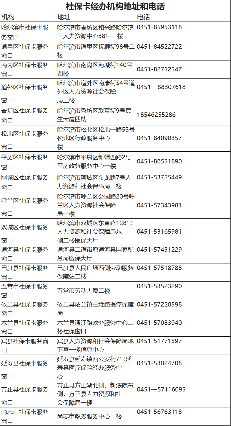 一、哈尔滨市人力资源和社会保障局 地址:哈尔滨市道里区友谊路423号人力资源和社会保障局大楼 电话:(0451)12333 二、哈尔滨各市区、县人力资源和社会保障局 1、道里区人力资