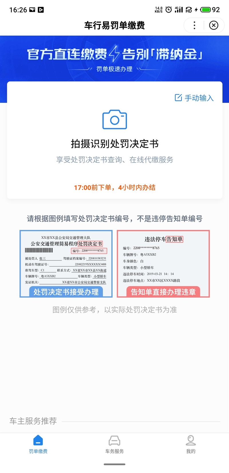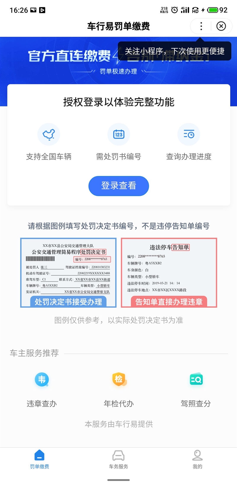 小程序办理流程第一步:打开百度APP,搜索『百度城市服务』,进入百度城市服务小程序,点击违章罚单缴纳 第二步:选择办理入口第三步:授权登录,扫描罚单,然后根据系统提示完成后面的办