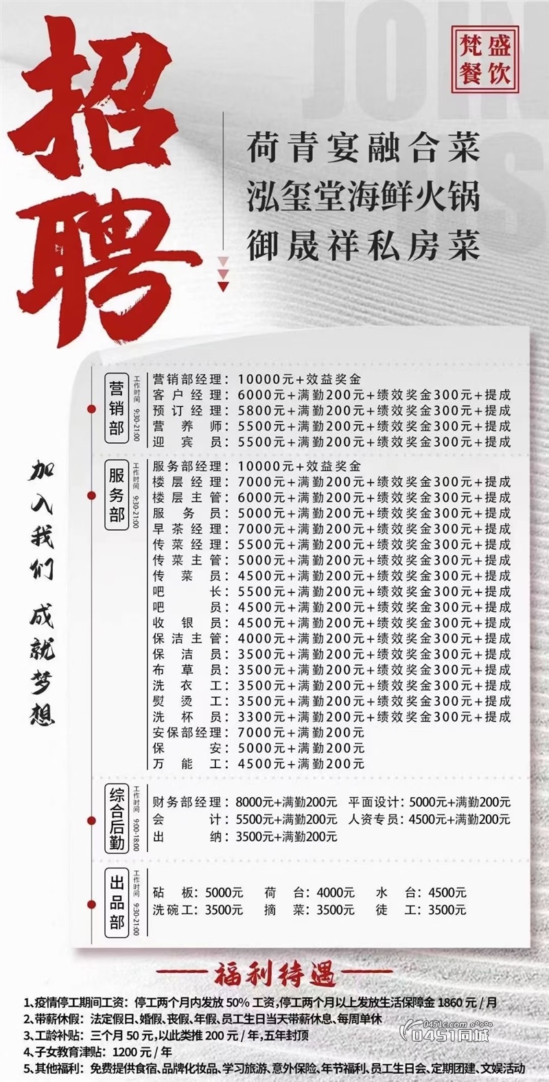 梵盛餐饮集团旗下泓玺堂海鲜火锅招聘业内小伙伴。