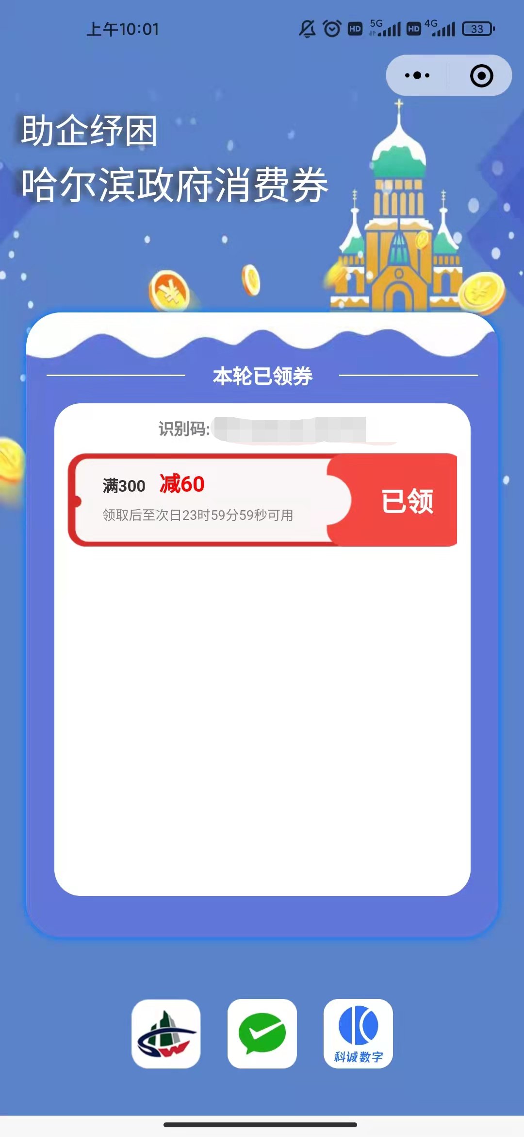 “哈尔滨助企纾团政府消费券”小程序上免费领取优惠券,用户在微信中,搜索“哈尔滨助企纾团政府消费券”找到对应小程序,通过小程序即可完成优惠券的领取。